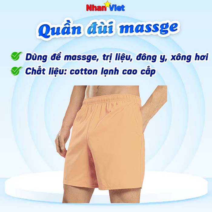 Quần áo massage body dạng quần đùi cotton phù hợp sử dụng cho nhiều liệu trình khác nhau như massage body toàn thân, massage cổ vai gáy, massage chân, bấm huyệt hay xoa bóp thư giãn. Sản phẩm cũng được nhiều spa lựa chọn làm trang phục dùng chung cho khách hàng nhờ tính tiện lợi và dễ vệ sinh.